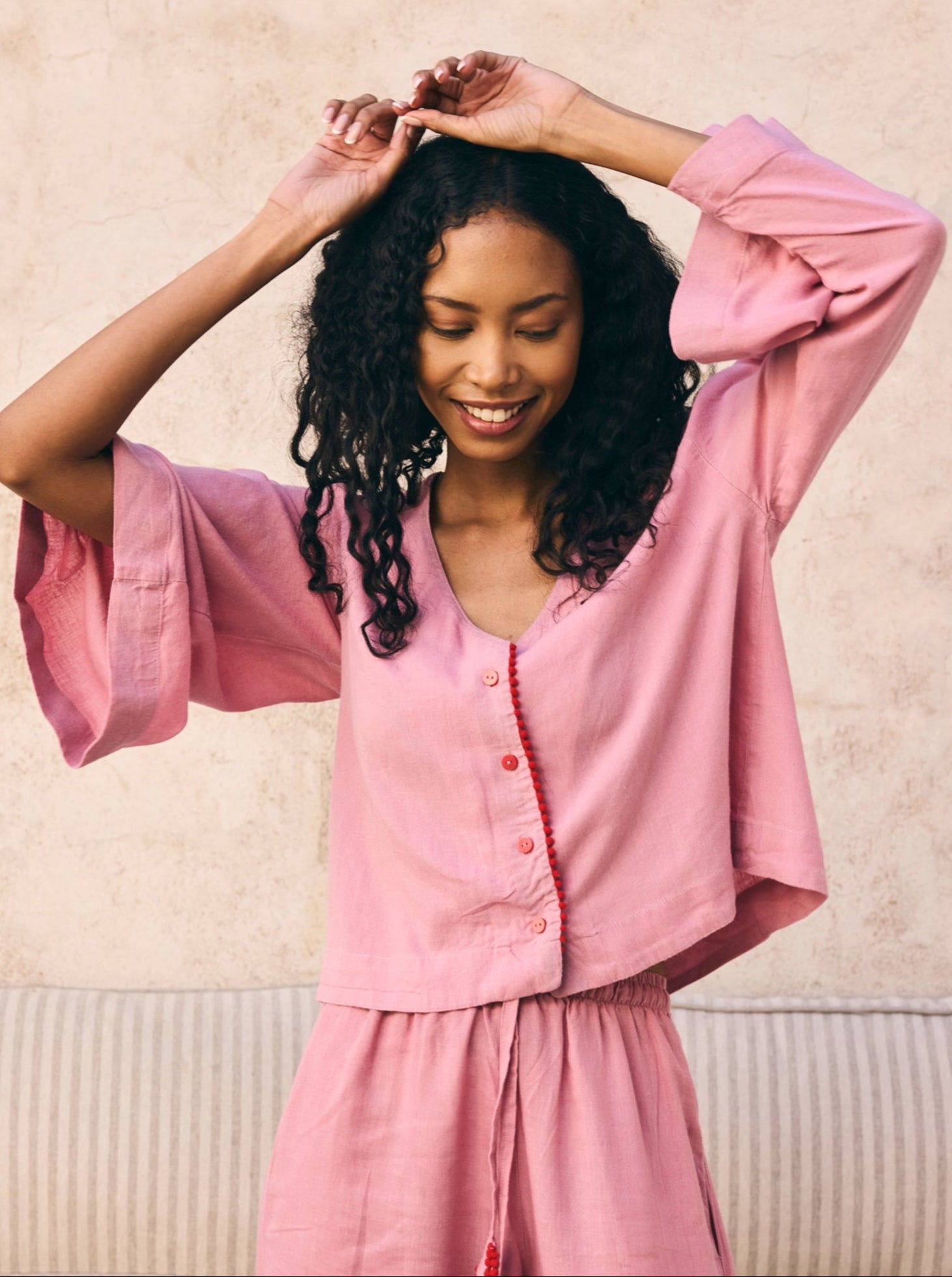 The softest, linen pyjamas imaginable. Luxury lightweight linen which is naturally breathable and incredibly soft. Featuring the cutest pompom details: these gorgeous sets are comfy enough for bed, and cute enough for coffee dates!